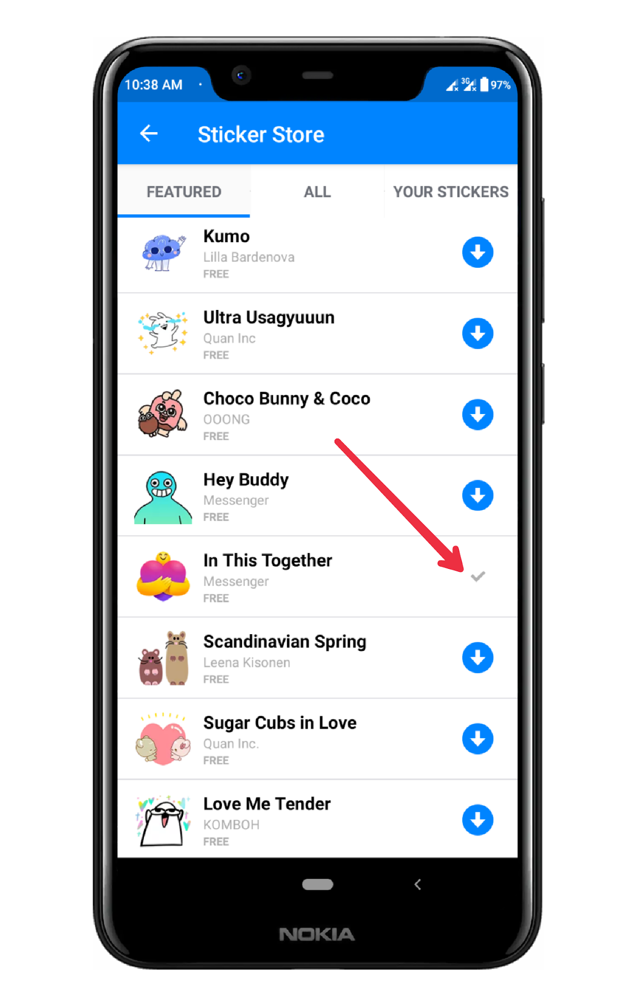 স্টেপ ৬: স্টিকার প্যাক ডাউনলোড হয়ে গেলে ডাউনলোড আইকন এর জায়গায় একটি টিক চিহ্ন আসবে।